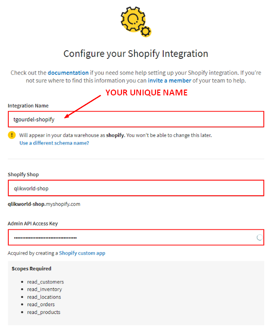 It's now time to configure the Shopify integration. Using the form below, insert: