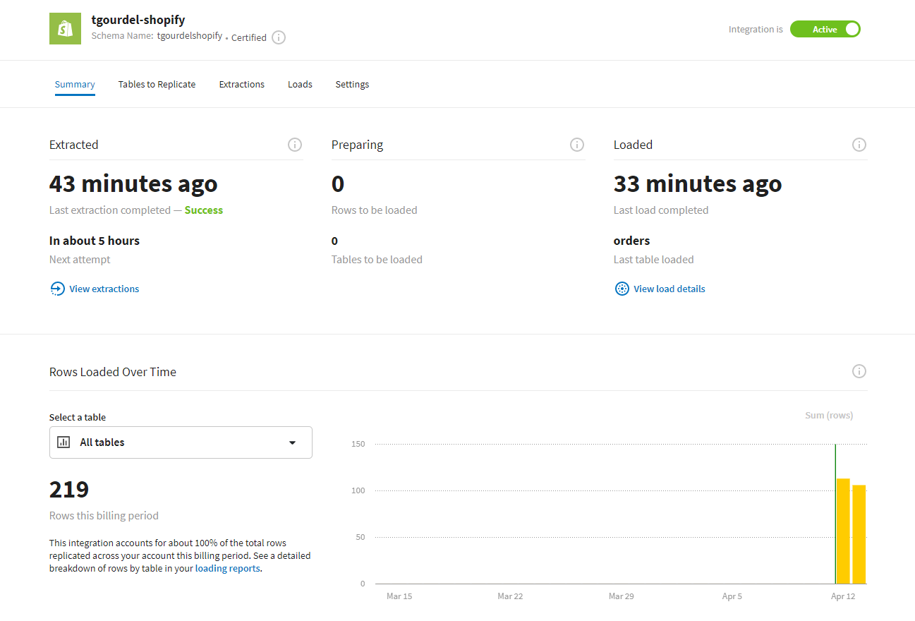 The home page summarizes the integrations and the overall volume of data being replicated.
