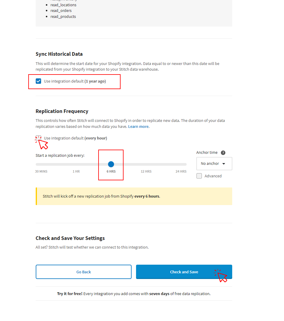 The following settings dictate how and how often Stitch will replicate data from your integration.