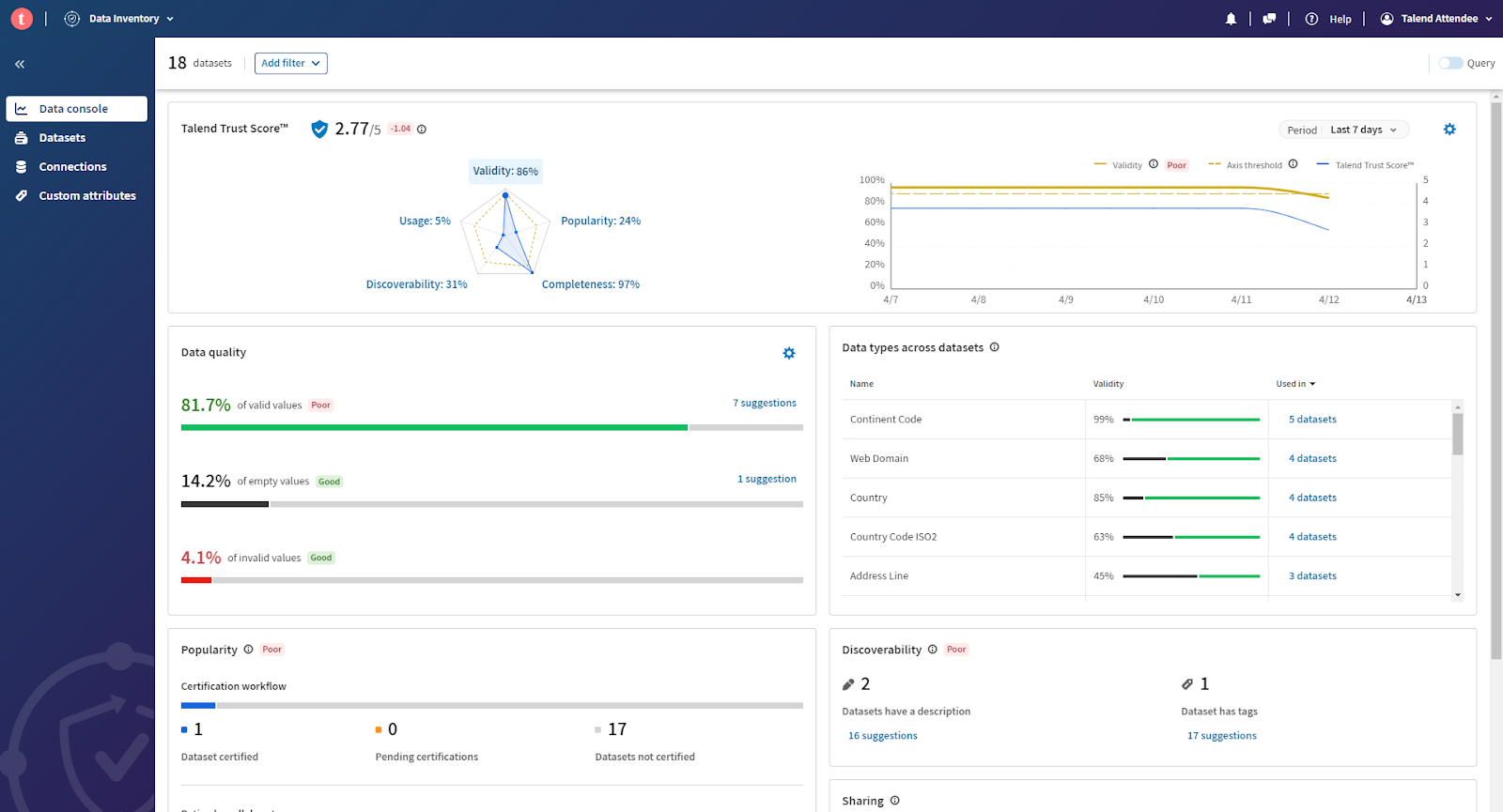 You can now take a look at the different tiles and tabs to discover Talend Data Inventory.