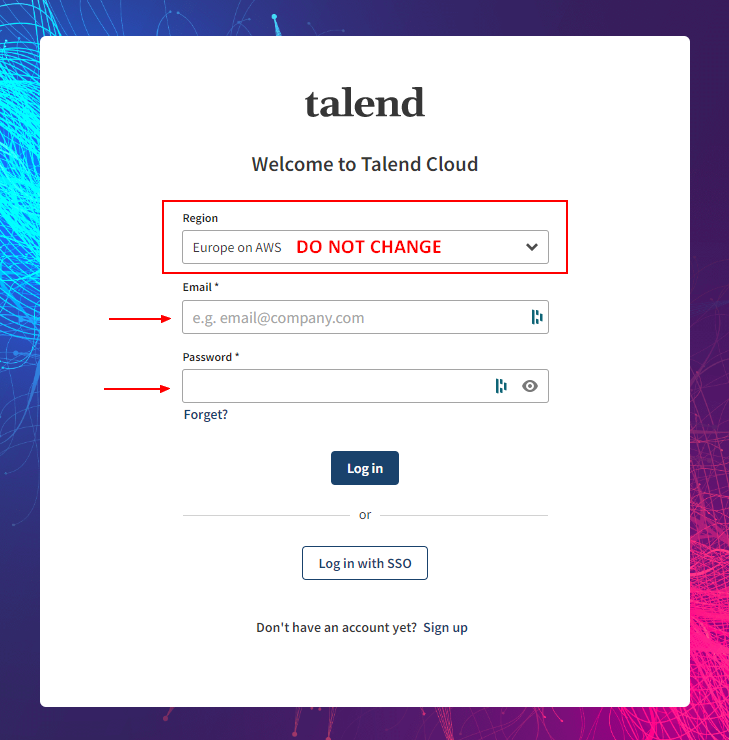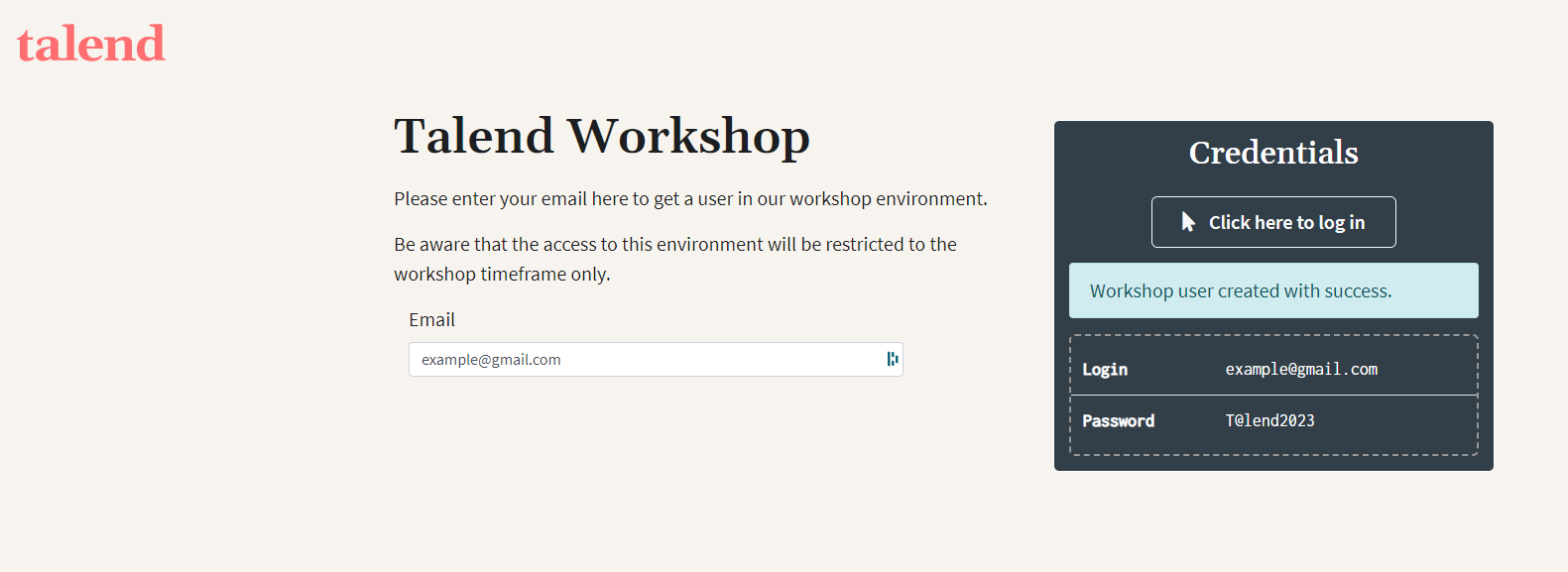Provide an email and copy the password. Click on "Click here to log in" to access Talend Cloud.
